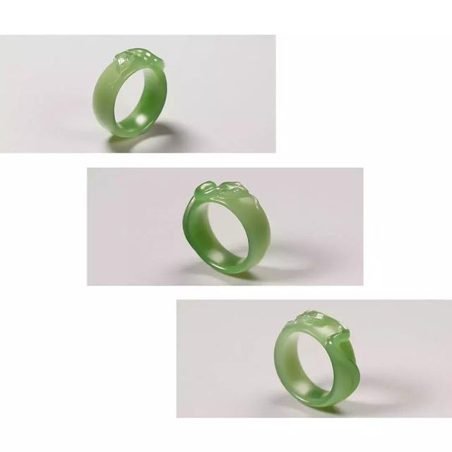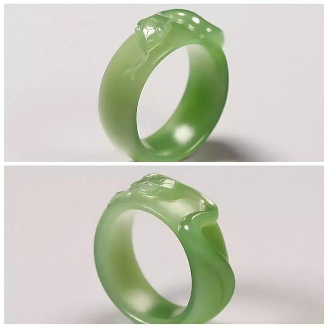 碧玉戒指,戒面匍匐一條靈蛇,呈S狀身形,口吐長信、凝眸以待,動感十足。作品造型纖巧,線條流暢,玉質光潤細膩,無瑕疵綹裂。