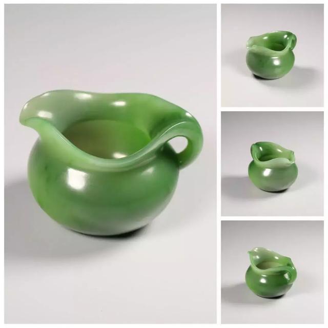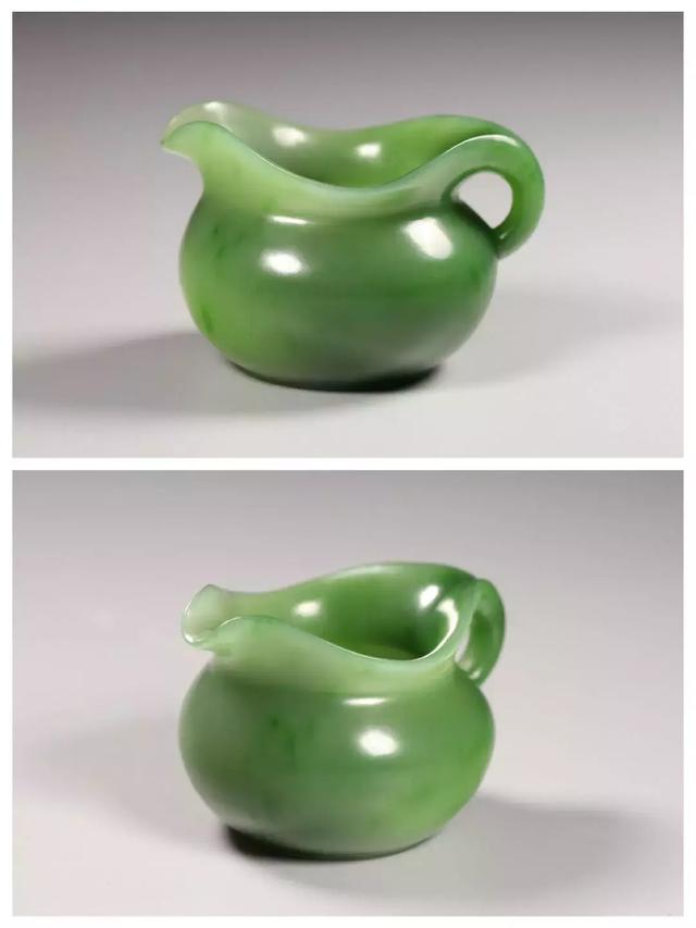公道杯,得名于朱元璋“九龍杯”典故。暗藏“知足者水存,貪心者水盡”之人生哲理,且告誡人們凡事務求公道,為人不可貪得。作品玉質細膩瑩潤,造型輕盈飄逸,線條流暢柔美如葉片翻卷,嬌翠欲滴。