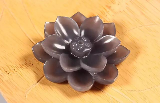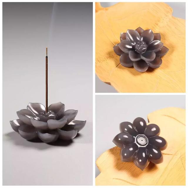 作品選用優質和田玉特色料煙青玉精心雕琢,整器泛紫羅蘭色,典雅高貴,玉質油潤;蓮花花瓣整齊有致,中心的小蓮蓬為插香處。佛教有“花開見佛性”之說,這里的花即指蓮花。人有了蓮的心境,就出現了佛性。蓮是百花中唯一能花、果(藕)、種子(蓮子)并存的。象征佛“法身、報身、應身”“三身”同駐。