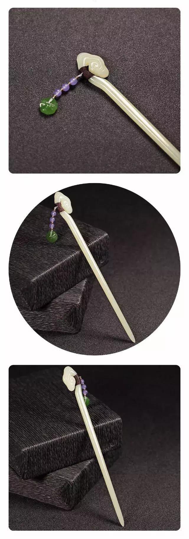 黃玉-如意發簪 黃玉發簪,玉質細膩油潤,色勻潔凈;釵頭雕如意圖案,墜飾以碧玉四葉幸運草、紫色瑪瑙珠配14K金珠搭配而成,整器線條流暢,獨具古典之美。