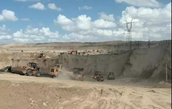 幾十臺挖掘機、鏟車、翻斗車搬運十幾米至幾十米厚的泥土層。