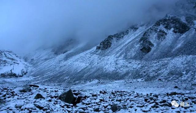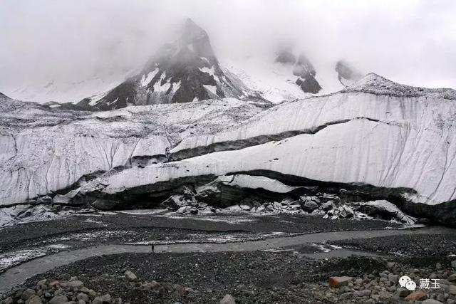 天陰下來,時而小雨,時而小雪;地勢越來越高,漸至寸草不生。腳下已經是冰川地形,堆得小山一樣高的蒼黑色冰磧石連綿起伏,這是千萬年間冰川移動和冰水沖刷堆積成的,石堆底下不是山體,而是亙古不化的厚厚冰雪;湍急的玉龍河水有時穿過地底巨大的冰洞,在遠處重新涌出地面。