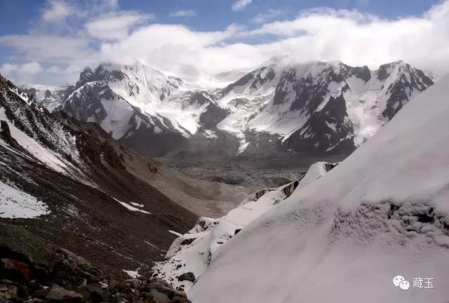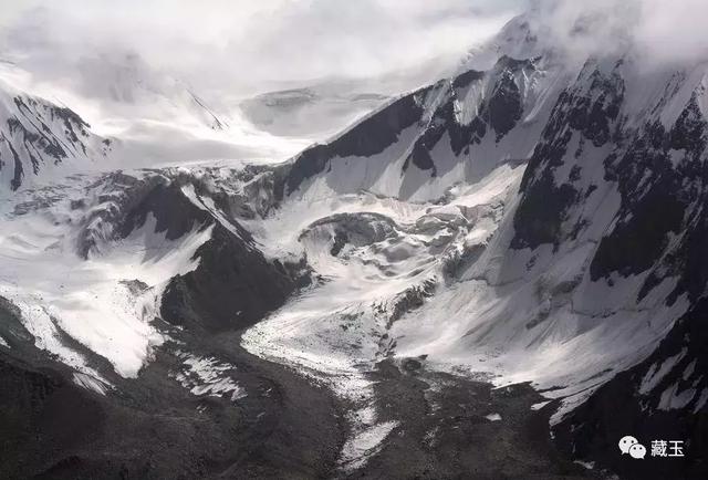 這里的海拔估計已經超過六千米,從高處看冰川,原來冰川頂上也有很多大冰縫,黑乎乎的,里面隱隱傳出轟隆水響。也許在我們腳下不遠處就是價值連城的和田玉礦床,可是隔著厚厚的冰層和冰磧石堆,誰都無法接近。