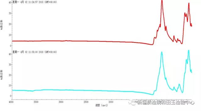 近日,筆者在客戶送檢的樣品中發(fā)現(xiàn)了一些蛛絲馬跡。有消費(fèi)者送來(lái)檢測(cè)的三只手鐲中發(fā)現(xiàn)了其中一只手鐲中含大量角閃石礦物,購(gòu)買是按和田玉(碧玉)的價(jià)格購(gòu)買的。有趣的是,這三只手鐲外觀看上去幾乎差不多,猛一看都以為是和田玉(碧玉),仔細(xì)分別可見(jiàn)端倪,有兩只手鐲中含黑色雜質(zhì)是呈點(diǎn)狀分布,另外一只里面黑色雜質(zhì)則是呈大面積塊狀分布,且透明度不好。經(jīng)紅外光譜進(jìn)一步檢測(cè),其特征吸收譜線有差別。透閃石的吸收峰(下圖紅色)與內(nèi)部黑色塊狀部分的紅外吸收峰(下圖藍(lán)色)不完全一致,是因其含了大量角閃石所致。而這些黑色角閃石質(zhì)礦物占據(jù)整體手鐲的三分之二,故不能鑒定為和田玉(碧玉)。