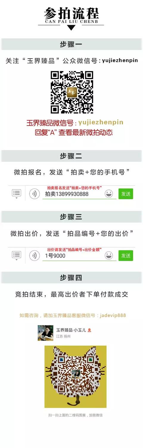 近期公眾號收到不少玉友的拍賣反饋,希望玉界臻品能夠推出一些玉質上乘、工藝講究的小精品來進行微拍,為了滿足一部分玉友日益增長的精神文化需求和對高雅藝術的追求喜愛,經過與玉雕師的反復商酌最終決定原《限時微拍活動》依然保留,同時再開設一檔以和田玉小精品為主題的微拍欄目,現商定暫時命名《臻品競拍》。此欄目不僅在作品的品質、雕工、創意上有了質的提高,并在拍賣規則上也做了相應的更改。(具體拍賣規則及參拍流程見本文末尾)