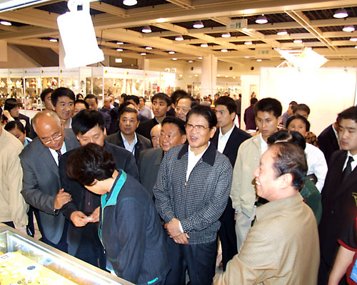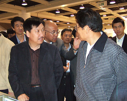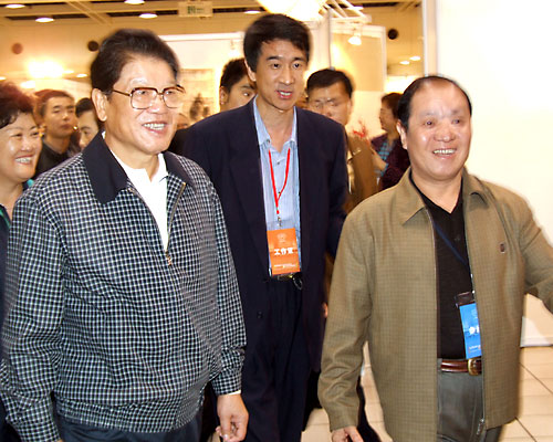 人大常委會(huì)副委員長(zhǎng)李鐵映在新疆工藝美術(shù)協(xié)會(huì)會(huì)長(zhǎng)陪同下參觀新疆工藝美術(shù)展位