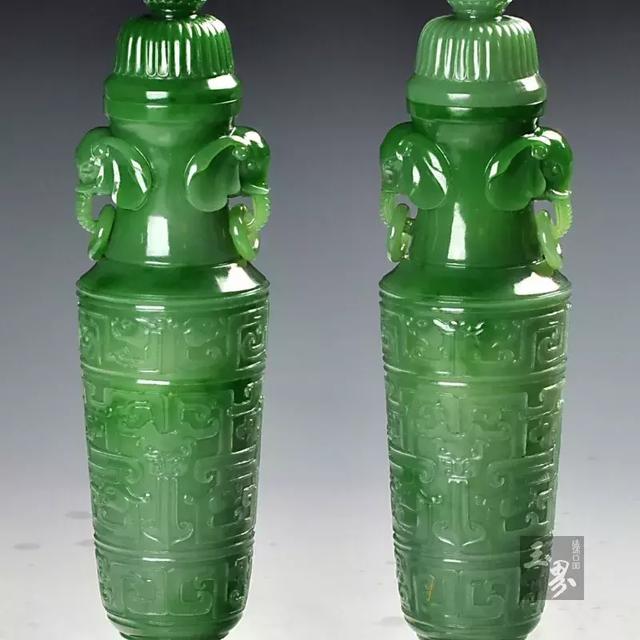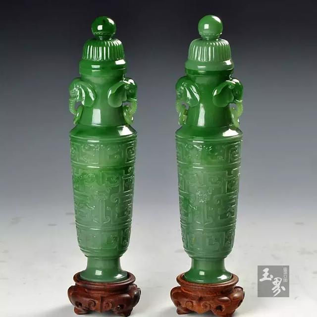▲碧玉對瓶-龍鳳紋飾吉祥瓶 | 玉器編號:105651