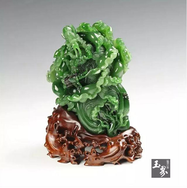 白菜的結構比較自然舒卷,層次分明,處處彰顯著一種大氣,佩戴方法也較為簡單。掛件往往以單個白菜出現,工藝特色主要在線條的拿捏上。而擺件白菜則更多與動植物結合出現。其中靈動的昆蟲則是白菜擺件的常客。白菜物體實,配以鏤空的昆蟲,彰顯虛實相生。如果再碰上俏色合理運用,藝術價值將大大提升。