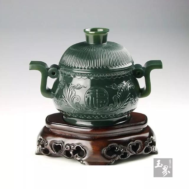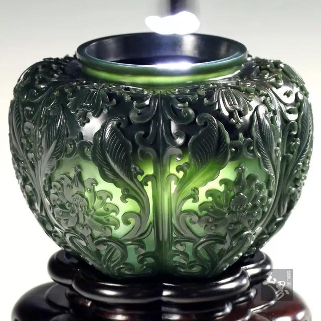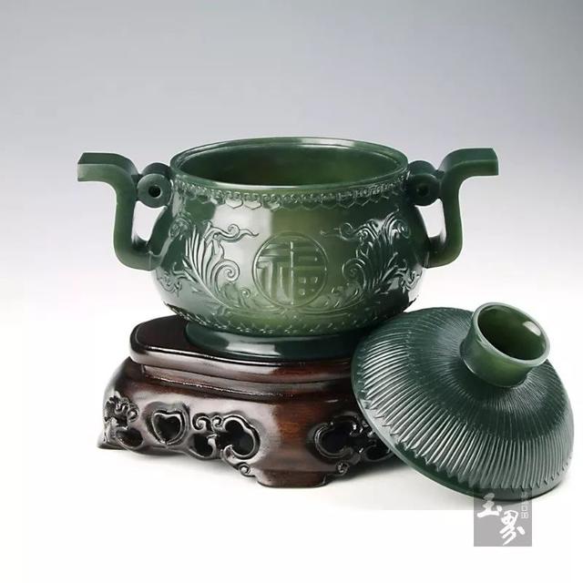 當青玉器皿具有一定薄意之后,光影的明暗對比強烈,會產生奇妙的透光效果,幽幽的黃綠色像水墨畫一樣暈開,似翻開了古老而又悠長的時光長卷。自此青玉便成為了薄胎器皿的主角。青玉器皿既是適用品,又是工藝品,既有適用價值,又有觀賞價值。其美觀主要表現在造型、裝飾、紋飾、材質、色澤上。其規格要求特別嚴謹。所以有增一分則太長,減一分則太短的玄妙之說。