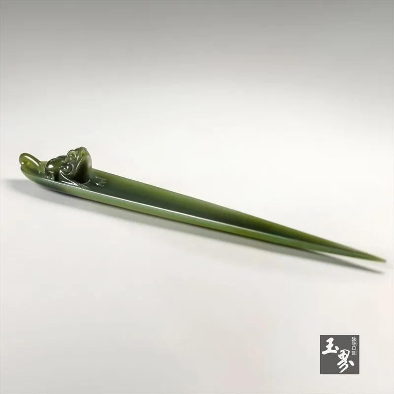 ▲青玉香插-竹葉蛙趣 | 玉器編號:163194