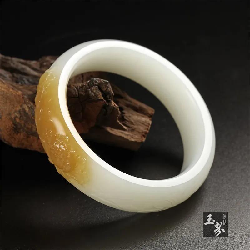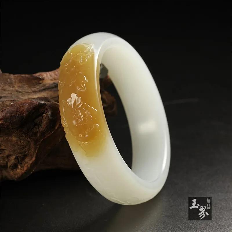 ▲ 糖白玉巧雕手鐲-花開富貴 | 玉器編號(hào):157971