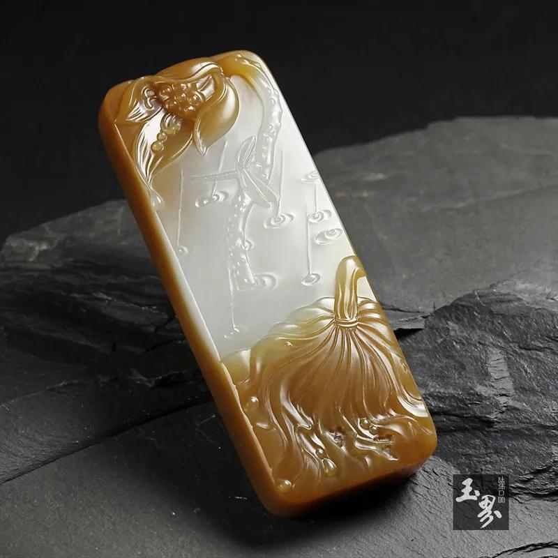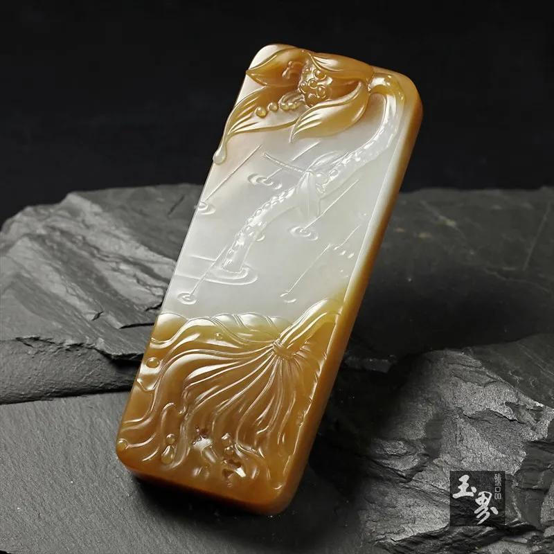 ▲ 糖白玉把牌-殘荷聽雨 | 玉器編號(hào):152063