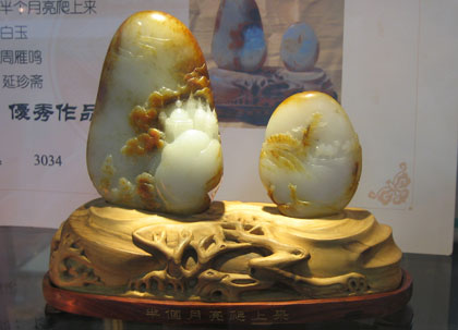 周雁明大師的獲獎作品:《半個月亮爬上來》是根據西部歌王王洛賓的歌曲創作的,兩塊一大一小的和田玉籽料,一前一后排列,恰似二座駝峰,又似行進中的駱駝,畫面上尖尖的伊斯蘭教頂,彎彎月牙配以黃楊木木雕底座,抽象地表現了西域大漠和胡楊樹的神奇。讓人們產生了無限的遐想。
