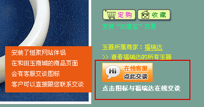 凡是正式安裝恒聚網站伴侶的企業會員,和田玉商城里的商品信息頁面里會有明顯的在線客服圖標,客戶只要點擊此圖標即可方便的與企業交談。同時會員企業網站里也會有網站客服的圖標,方便消費者和企業的溝通,幫助企業抓住轉瞬即失的商機!