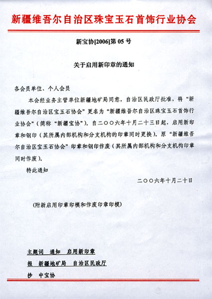 本會經業務主管單位新疆地礦局同意,自治區民政廳批準,將“新疆維吾爾自治區寶玉石協會”更名為“新疆維吾爾自治區珠寶玉石首飾行業協會”(簡稱“新疆寶協”)。自二零零六年十月二十三日起,啟用新印章和鋼?。ㄆ渌鶎賰炔繖C構和分支機構的印章同時更換)。原“新疆維吾爾自治區寶玉石協會”印章和鋼印作廢(其所屬內部機構和分支機構印章同時作廢)。