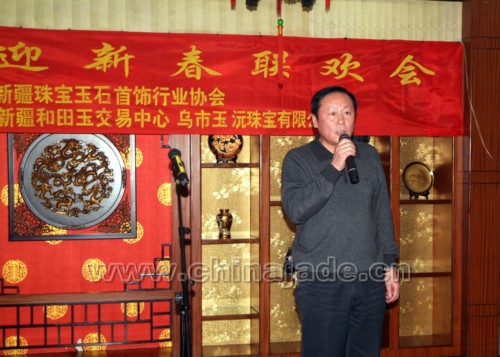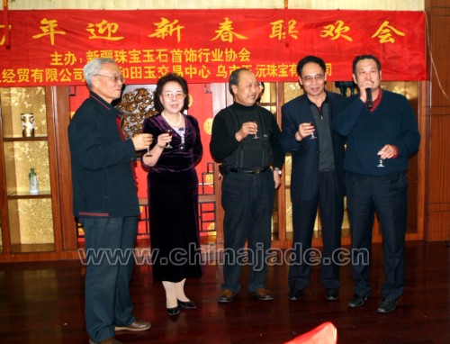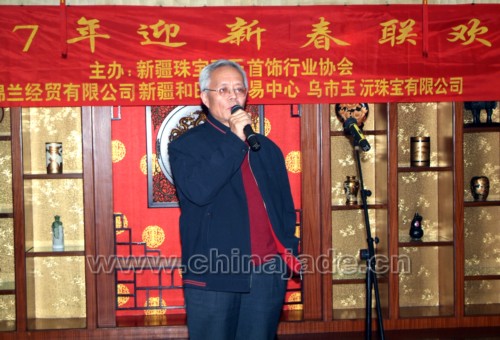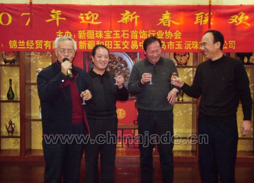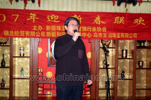 2007年元月14日,暖冬的烏魯木齊洋溢著節日前的喜慶。座落在烏魯木齊繁華地段的人民飯店二樓宴會廳更是燈火通明、人頭攢動。此刻,新疆珠寶玉石界近一百多位同仁們歡聚一堂,大家互相問候、共祝新年、其樂融融、熱鬧非凡。參加晚會的單位及領導有自治區地礦局副局長朱立、自治區國土資源廳副廳長新疆觀賞石協會會長姚和江、自治區民政廳社團處處長閻鵬、自治區工美協會理事長王繼成、自治區收藏家協會會長岳峰、自治區礦產實驗研究所所長賈挺凱、新疆礦產研究所所長白文賢、自治區寶玉石質檢站副站長岳蘊輝、新疆自治區金銀制品質檢站副站長李新嶺、新疆寶協常務副會長李澤昌、新疆寶協秘書長易爽庭、新疆寶協在烏的副會長及常務理事、理事及會員代表,還有新聞媒體烏魯木齊晚報、消費晨報、中國和田玉網、中國和田玉籽料網等的代表。