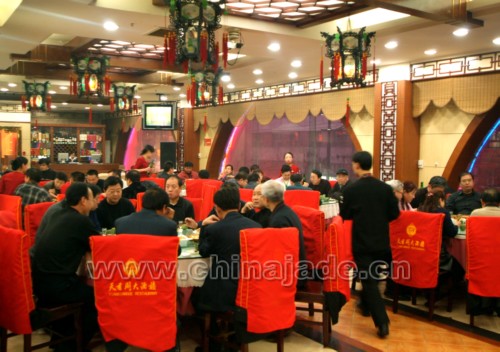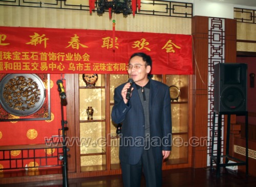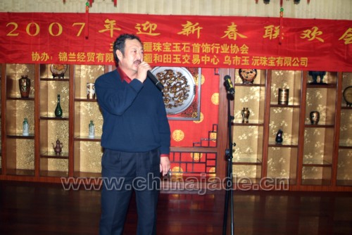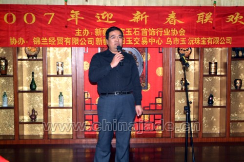 在晚會上自治區地礦局副局長朱立向大家致新年問候并作了重要講話,他說:“過去的一年成績是可喜的,變化是顯著的,目前我們的玉石行業在新疆已形成了一集原料供應、加工、銷售為一體的產業鏈,在新的一年里,我們在坐的每一位都肩負著把新疆玉石產業,中國玉文化發揚光大的使命”。朱立副局長的講話贏得了大家的熱烈掌聲。晚會上同行們相互交流,共謀新年發展。自治區寶玉石質檢站副站長岳蘊輝發言時頗有感慨地說:通過質檢玉石產品的統計,在1999年全年的玉石產值大概在8000萬元左右。而在2005年玉石產品全年的產值在15億左右,這些數據說明玉石產業迎來了一個黃金時期,希望在座的各位抓住機遇,在新的一年里取得更好的業績。