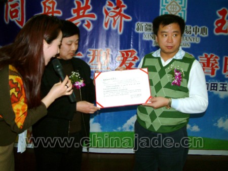 烏魯木齊市兒童福利院黨委書記閆育文向新疆和田玉交易中心頒發榮譽證書