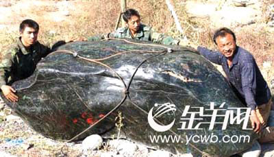 任忠先(右)和他的弟弟及一個工人在抱5.2噸大碧玉