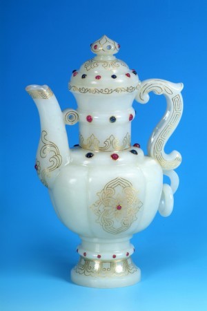 玉器中的金銀錯工藝(玉器行業俗稱壓絲工藝)及金銀錯嵌寶石工藝,多見于清代乾隆年間。清代以前有金玉結合件(金鑲玉工藝)、花絲鑲嵌(多見于首飾件、佩飾)等工藝組合的玉器出現,但非金銀錯工藝。清代乾隆年間由“痕都斯坦”進貢清廷的玉器中有很多金銀錯嵌寶石玉器。“痕都斯坦”是清廷對北印度蒙兀爾帝國的稱呼,位于現今克什米爾地區及北印度一帶。乾隆二十四年清廷派兵平定了天山南麓回部大小和卓的叛亂,鞏固了清政權后,喀什準噶爾部每年都進貢一批玉器。所進貢之玉器皆出產于“痕都斯坦”,主要是生活中實用器物,有碗、盤、杯、盒子、洗子、文房用具、刀具等等。器形獨特別致,胎體薄如蟬翼,紋飾觀之凸出,撫之無痕。圖案主體一般為莨苕紋或鐵線蓮、菊花等植物。除嵌有精美的金銀絲外,還嵌有各色寶石及玻璃。無論是器物獨特的造型與做工,或是紋飾圖案都具有濃厚的伊斯蘭風格。件件精美絕倫,充分體現了玉、金銀、寶石相組合后產生的無限美感。使器物的形、紋、色、質、澤、做工都達到了完美的境界。