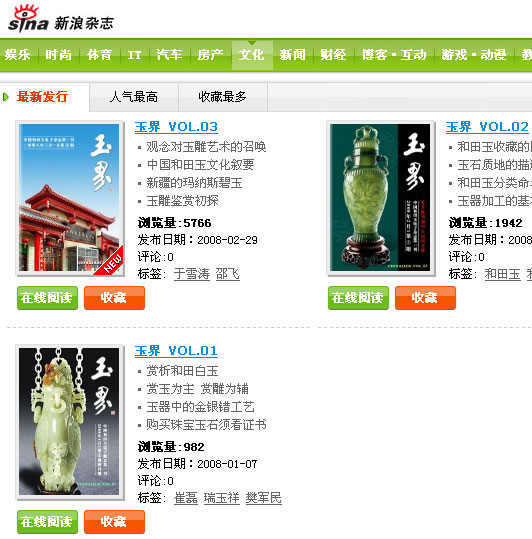 中國和田玉網與新浪網雜志頻道簽署發行合作協議,中國和田玉網《玉界》電子雜志正式登陸中國最具影響力的門戶網站新浪網。
