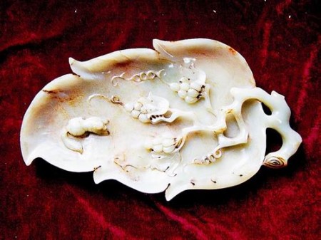 清代青白玉松鼠葡萄葉形洗