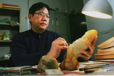 玉滋潤,不似翡翠般艷美,卻時常流露出中性內斂的韻味,寬容忠厚之性,白玉結構緊實,質地細膩,洪新華打磨著璞玉,也在打磨自己,他的靈魂可以說跟白玉是相通的了。