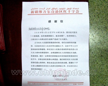 汶川地震發生后,災情牽動著新疆珠寶玉石企業的心。5月13日上午,新疆寶協的倡議書在中國和田玉網發出后,得到了廣大會員單位和個人的積極響應,很多企業主動派人將捐款送至新疆寶協辦公室。遠在且末的且末玉石礦礦長田寶軍和庫爾勒、喀什等地的會員單位立即通過電匯將捐款寄了過來,石河子、瑪納斯等地的會員單位更是驅車上百公里,獻上了一片愛心,送來了他們的捐款。