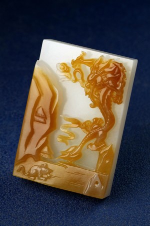 另外,用皮要巧。從目前來看,子料牌子的收藏升值空間顯然要大于其它玉料。因此子料的標志——保留玉皮往往成為了現代子料玉牌的常用手法。皮子的保留有很多形式,比如背面的滿皮,側面的留皮和正面的俏皮,玉皮的顏色多種多樣,在設計上俏色技法的使用就很關鍵,皮子做得好,牌子的藝術價值和經濟價值都會增高不少。