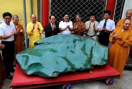武漢歸元禪寺方丈隆印大師說:“中國人信奉玉隨人緣,石有靈性。今年5月我與郭紹成先生在武漢巧遇,可以說是有緣有分吧。這塊與我們千載難逢的和田玉巨石運抵武漢后,眾僧將舉行盛大儀式接玉歸寺。我們已經請了很好的玉石雕刻大師 ,將這塊青碧玉巨石雕塑成佛像,千秋萬代讓廣大百姓供奉、為民祈禱福安。”