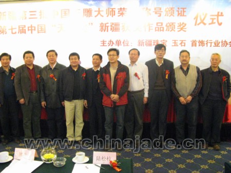 新疆寶協秘書長李忠志向與會代表介紹了樊軍民、陶虎、周雁明三位玉雕大師所取得的成績,隨后,在大家熱烈的掌聲中,樊軍民、陶虎、周雁明三位大師走上主席臺,從新疆寶協會長董連慧手中接過了“中國玉石雕刻大師”的榮譽證書,現場氣氛達到了高潮。