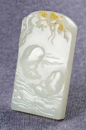 另外,用皮要巧。從目前來看,子料牌子的收藏升值空間顯然要大于其它玉料。因此子料的標志——保留玉皮往往成為了現代子料玉牌的常用手法。皮子的保留有很多形式,比如背面的滿皮,側面的留皮和正面的俏皮,玉皮的顏色多種多樣,在設計上俏色技法的使用就很關鍵,皮子做得好,牌子的藝術價值和經濟價值都會增高不少。