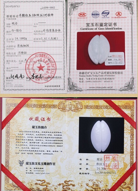 岳老師:您好!我的第二件:省級玉雕大師【崔疆勝】作品 和田玉料羊脂玉觀音對牌掛件24.1g。1。我想知道證書是真的嗎?石頭和證書是否一致。2。收藏證書上寫的是和田玉,這塊是籽料還是別的?3。如果方便,能否估計(jì)大約價格。懇盼回復(fù),再次拜首。