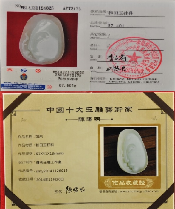 岳老師:您好!欣賞您的火眼金睛,更喜歡您的詼諧幽默。我個(gè)人認(rèn)為,現(xiàn)在很多有實(shí)力的年輕人,只追求國外的名車手表,而不關(guān)心祖國傳承下來的玉石工藝文化是不可取的。獨(dú)一無二的美,才是永遠(yuǎn)的時(shí)尚。我是一個(gè)玉的門外漢,我不希望能撿漏,也不希望做賺別人便宜的生意,但是我絕不希望被欺騙。所以我只買新疆本地大師的作品,但是自己也心里沒底,只能從雕刻上看意境。聽說和田玉7分看品質(zhì),3分看做工,而我只能看看做工。所以今天挑了2件發(fā)上來,希望您的法眼能幫我鑒別一下。我無言感激。第一件玉雕大師陳曙明作品 和田玉籽料如來掛件 蘇工 57克,1。我想知道這塊玉是不是真的,證書跟玉是否一致。2。鑒定證書上特征和折射率都沒有表明是否正常,我是否需要重新檢測。3。如果方便,能否估計(jì)大約價(jià)格。懇盼回復(fù),拜首而候。圖片共2張。