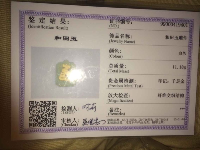 這是我朋友前段時間出差烏魯木齊給我帶回的手件,重量244克,尺寸,79.8*63*43mm,價格1w5,證書查過了是真的,我很喜歡,但找玉器店朋友看了下說是俄料的,心中有些失落,請老師看看是什么料的,值這個價嗎.